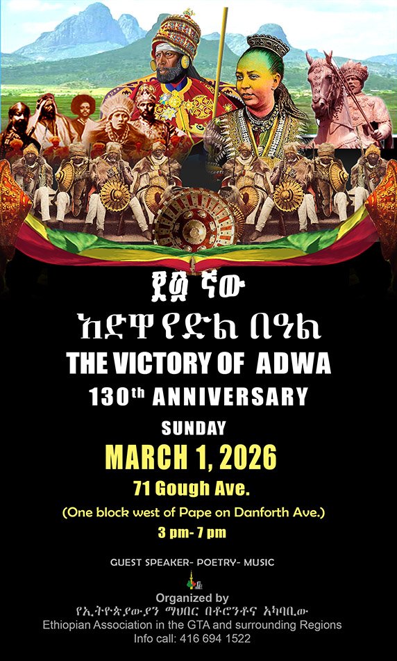 Adwa Victory Day Commemoration Join us in commemorating the 130th Anniversary of the Victory of Adwa as part of Black History Month — a moment of pride, resilience, and global significance. 📅 Sunday, March 1, 2026 📍 71 Gough Avenue 🕒 3:00 PM About the Victory of Adwa: On March 1, 1896, Ethiopian forces led by Emperor Menelik II won a decisive military victory against the colonial invasion at the Battle of Adwa, successfully defending Ethiopian sovereignty and stopping a forceful attempt to colonize the nation. This historic triumph was one of the first times an African army defeated a European colonial power during the Scramble for Africa, and it secured Ethiopia’s independence at a time when most of the